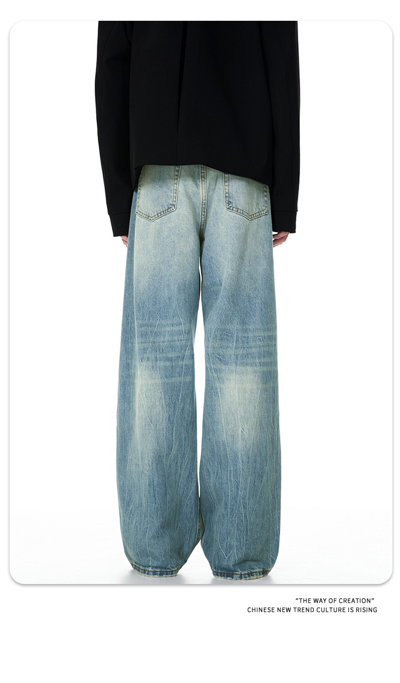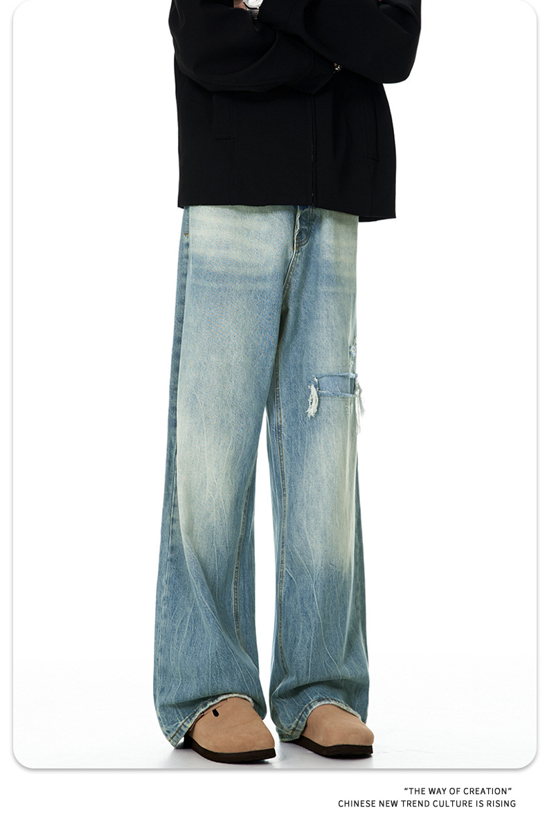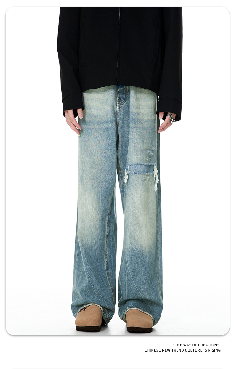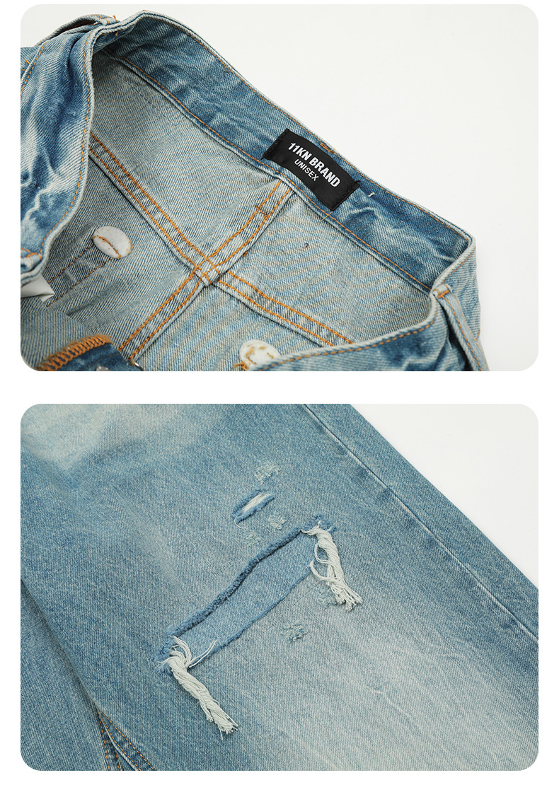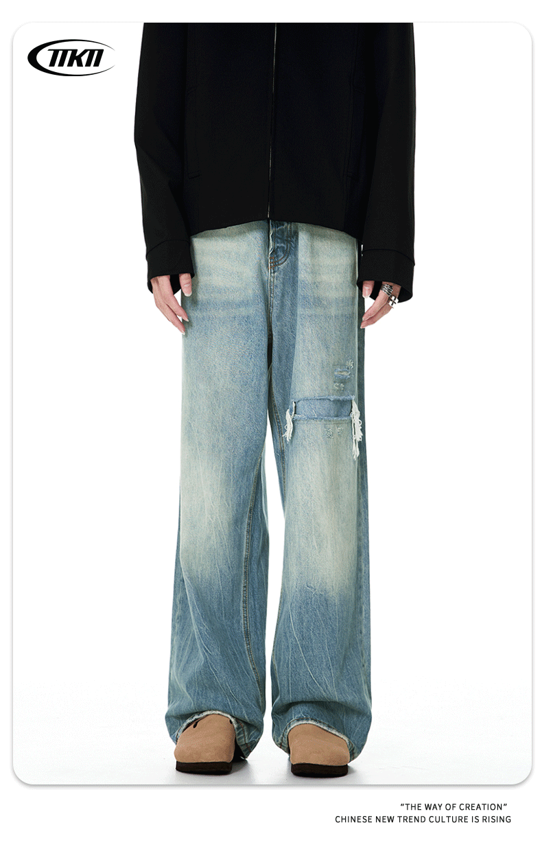 Premium Blue Denim Pants for Men and Women - Knife-Cut Destruction, Water Washed, Wide-Leg Casual Trousers