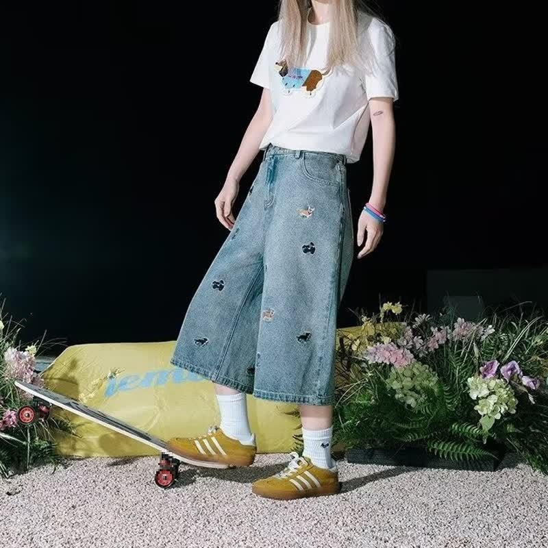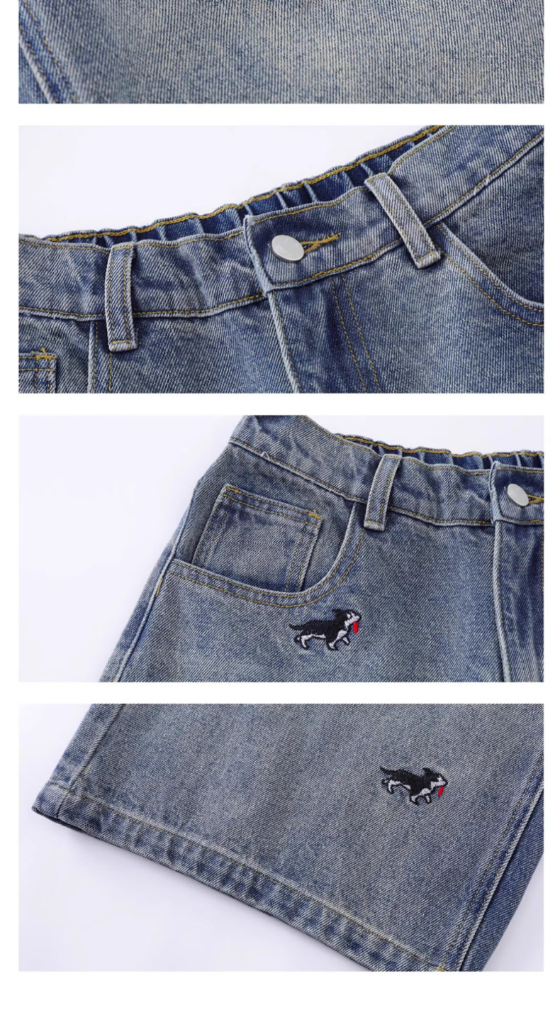 Step into summer with our Cartoon Dog Embroidery Washed Five-Quarter Denim Shorts, designed for both men and women who appreciate style and comfort. These shorts are not just a piece of clothing; they are a statement of personality and fun.