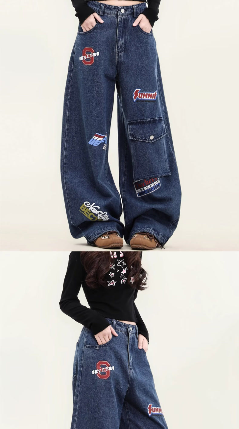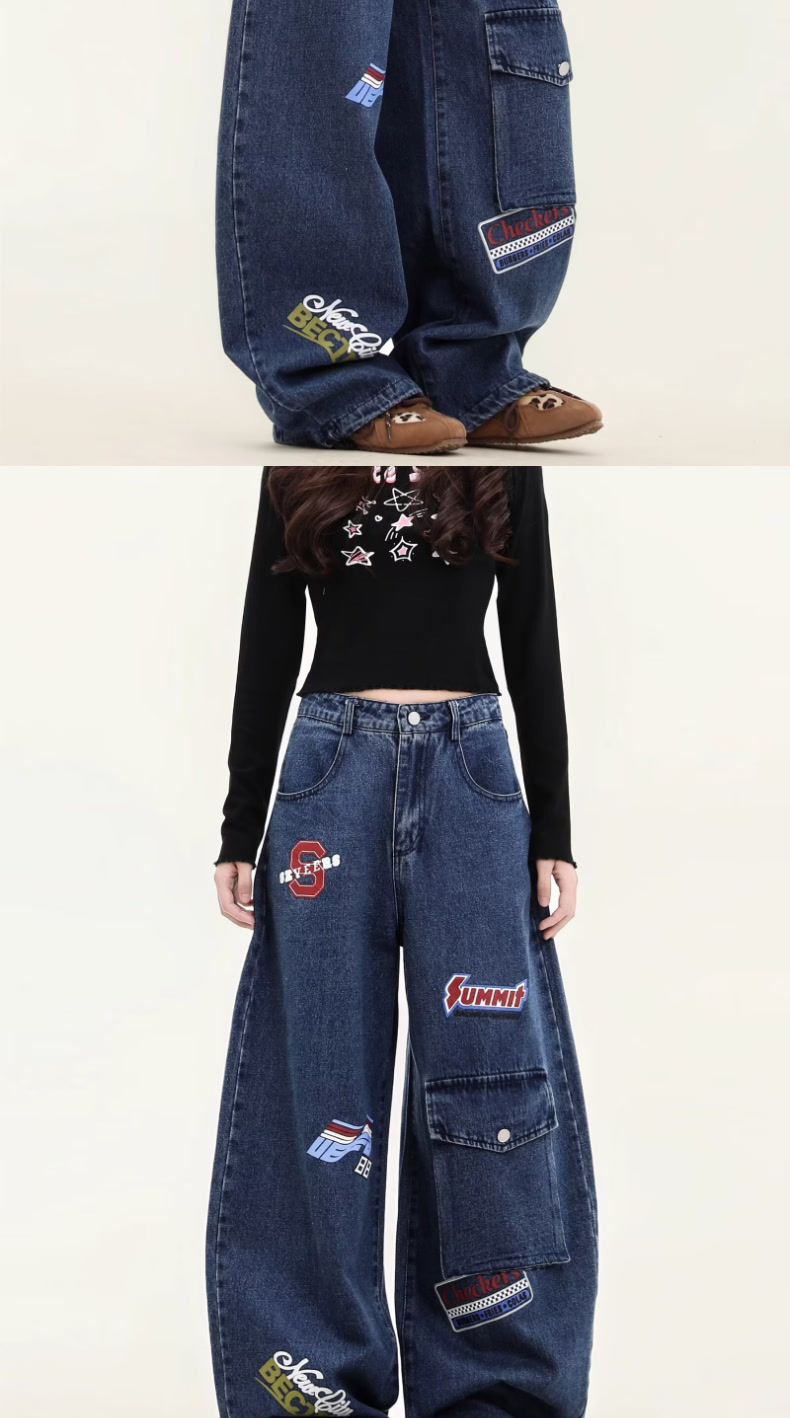 Design Sense Embroidery Patch Denim Pants - Unisex Loose Fit Multi-Pocket Trousers