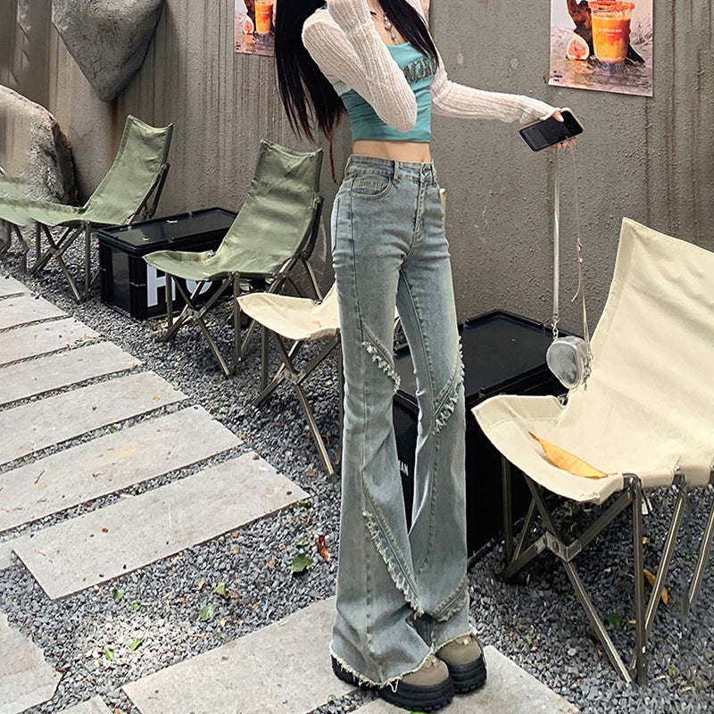 Design Sense High-Waist Frayed Hem Flare Jeans for Women - Slim Fit Versatile Denim Pants