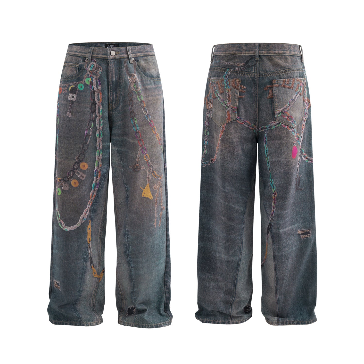 Experience the blend of street style and comfort with our High Street Waste Soil Feng Shui Wash 3D Printed Wide Leg Jeans.