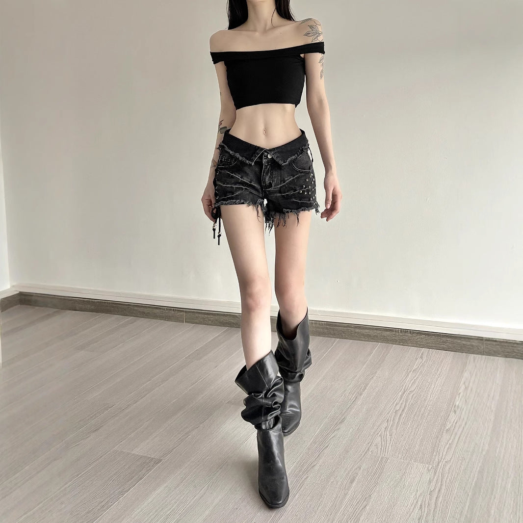 Unleash your inner rebel with our Hippie Spicy Girl Street Motorcycle Style Rolled Hem Low Waist Denim Shorts. Perfectly blending edgy street style with casual comfort, these shorts are designed for those who dare to stand out.