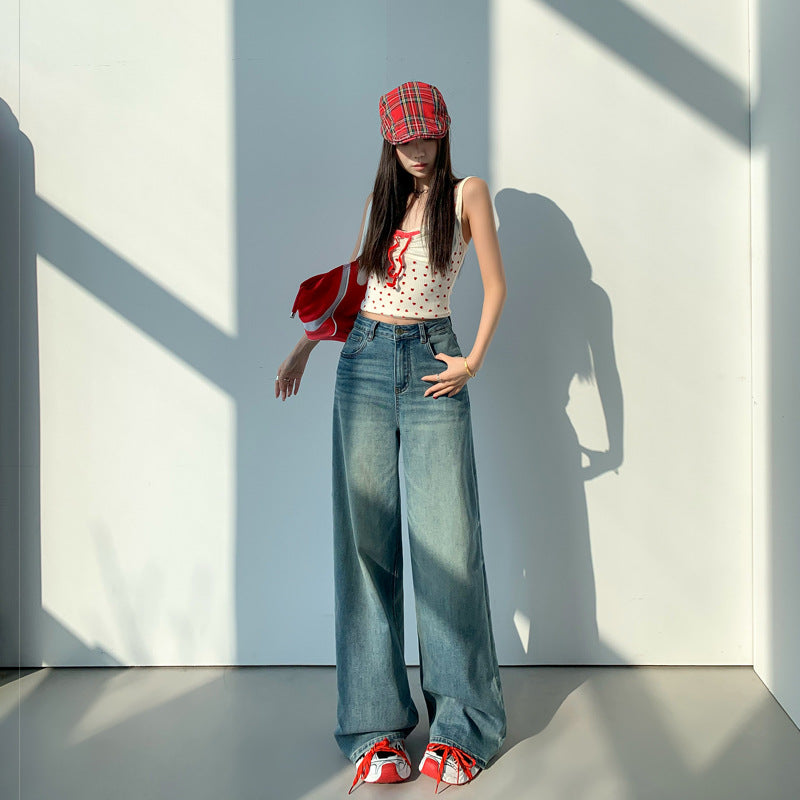 Klein Blue Wide-Leg Jeans for Women – Soft Elastic, Loose Drape, Straight Floor-Length Pants