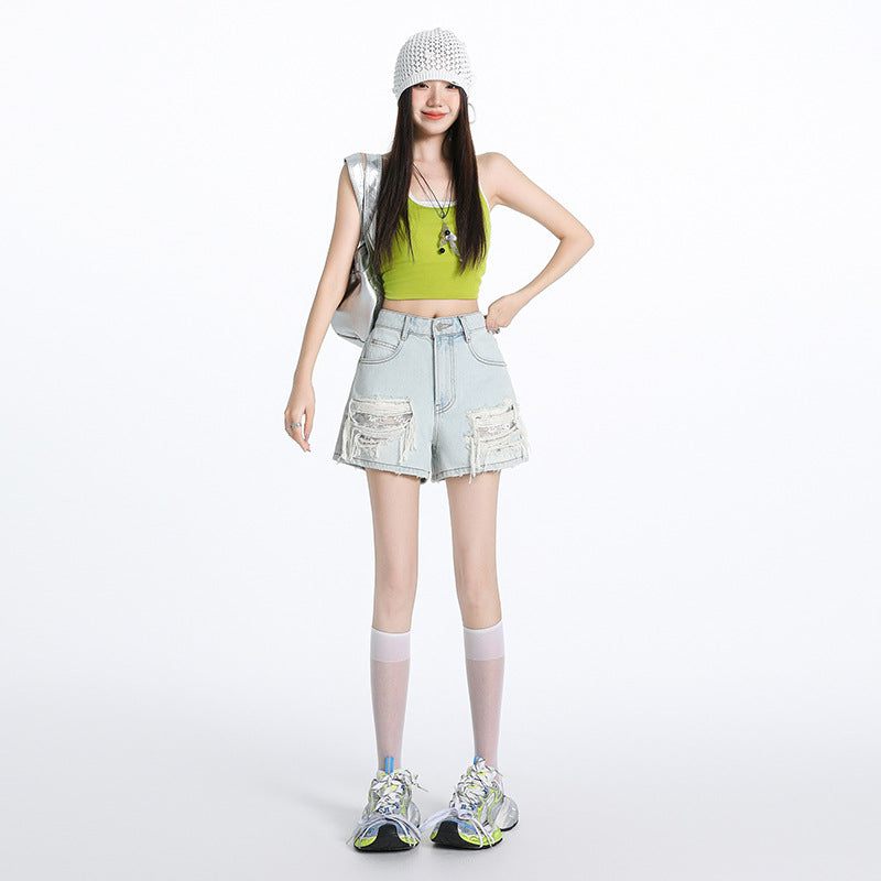 Light Blue Distressed Lace Denim Shorts for Women - High Waist Slim Wide Leg A-Line Hot Pants