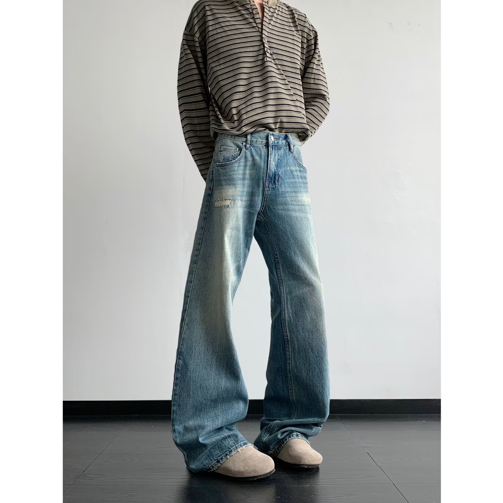 Light Blue Men's Cat Whisker Washed Wide Leg Casual Pants