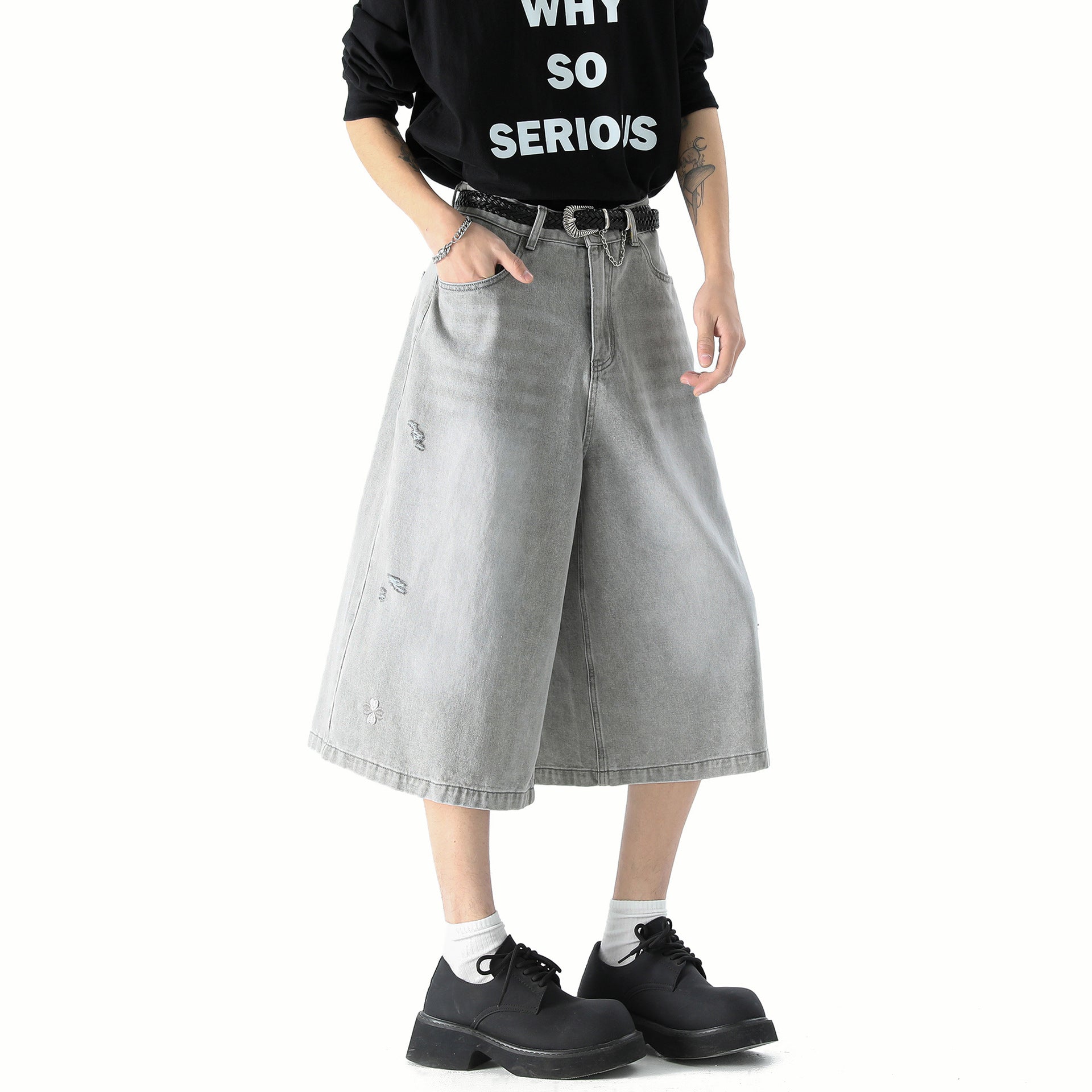 Step out in style with our Men's Seven-Quarter Denim Pants, designed for comfort and versatility. These trousers embrace a modern aesthetic with their wide-leg flare and knee-length cut, making them perfect for casual outings or relaxed gatherings.