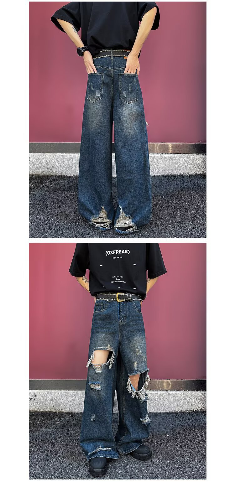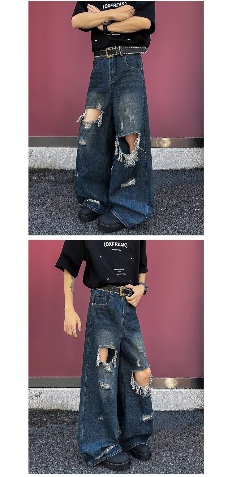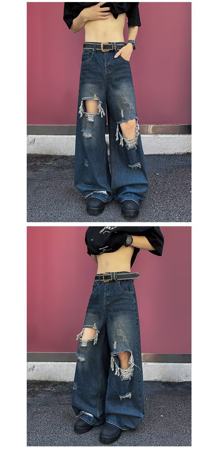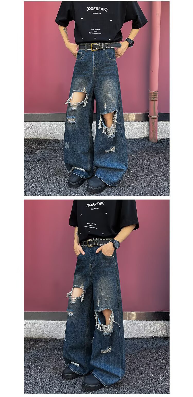 Pierced Floor Mopping Denim Distressed Straight Leg Wide Leg Pants
