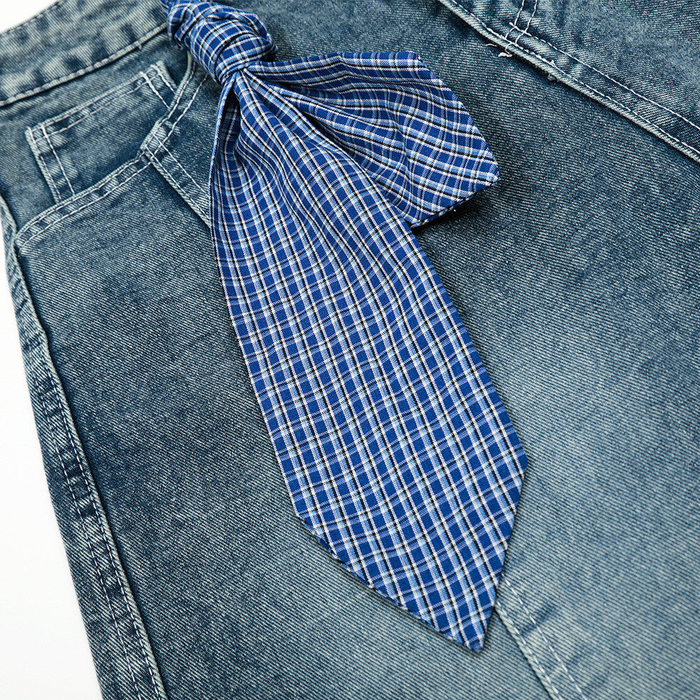 Punk Washed Distressed Denim Shorts for Men with Plaid Belt and Contrast Pockets