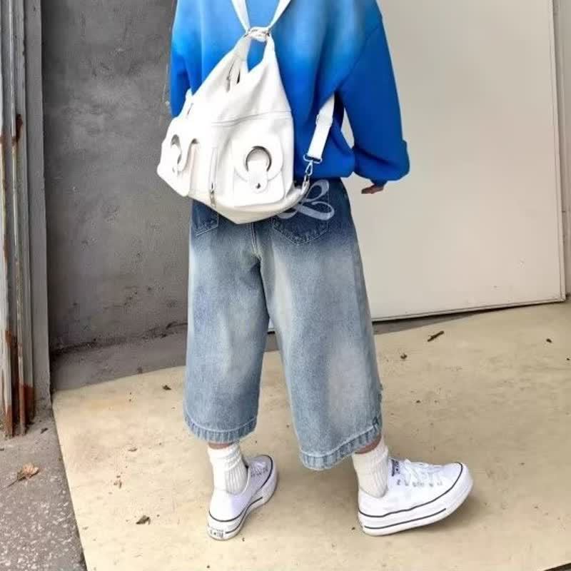 Retro Gradient Washed Distressed Denim Shorts - Unisex Summer Straight Loose Wide Leg