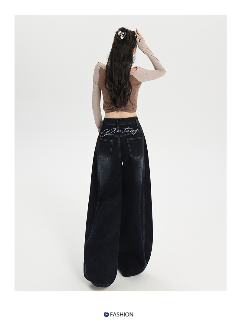 Retro Washed Loose Embroidered Tapered Denim Pants for Women