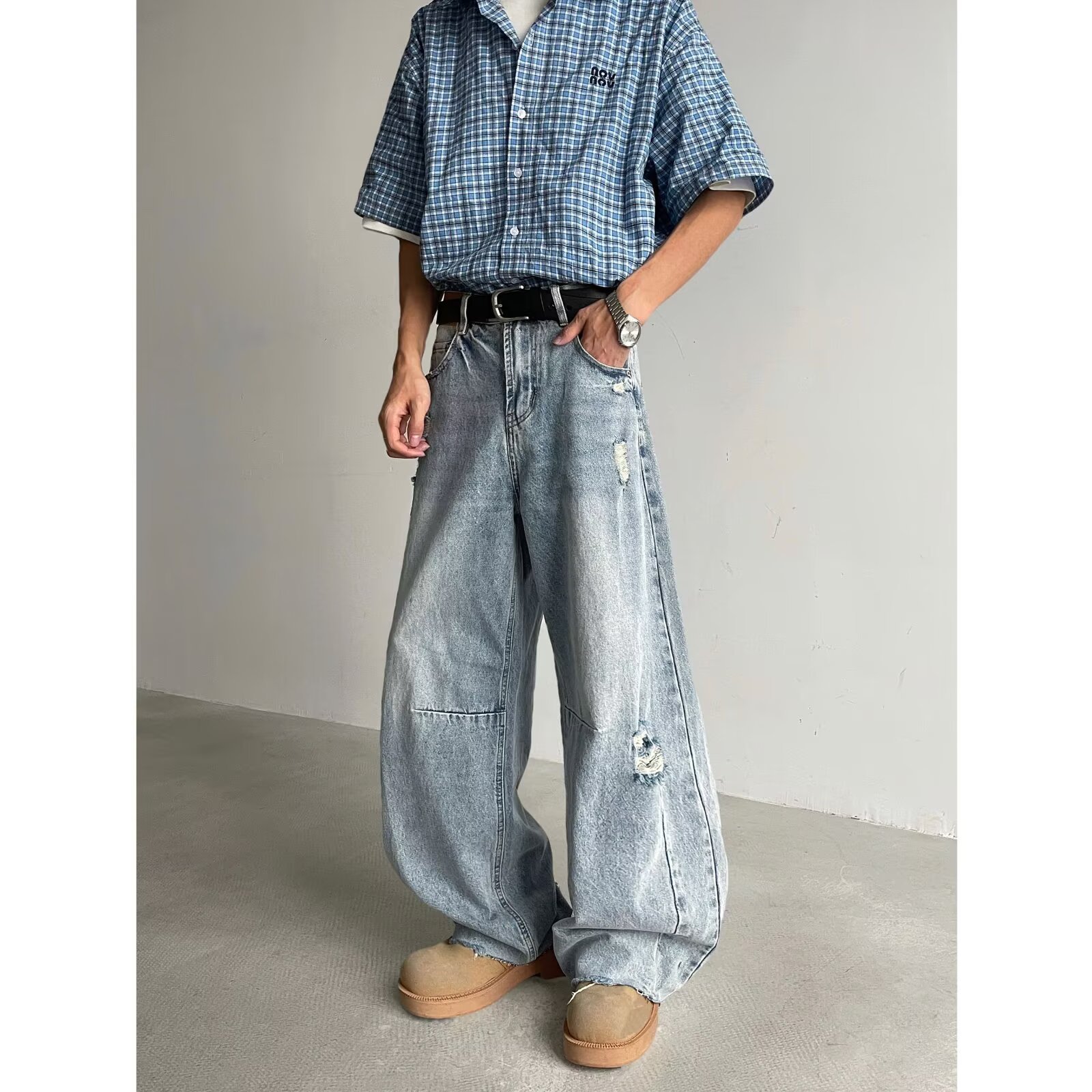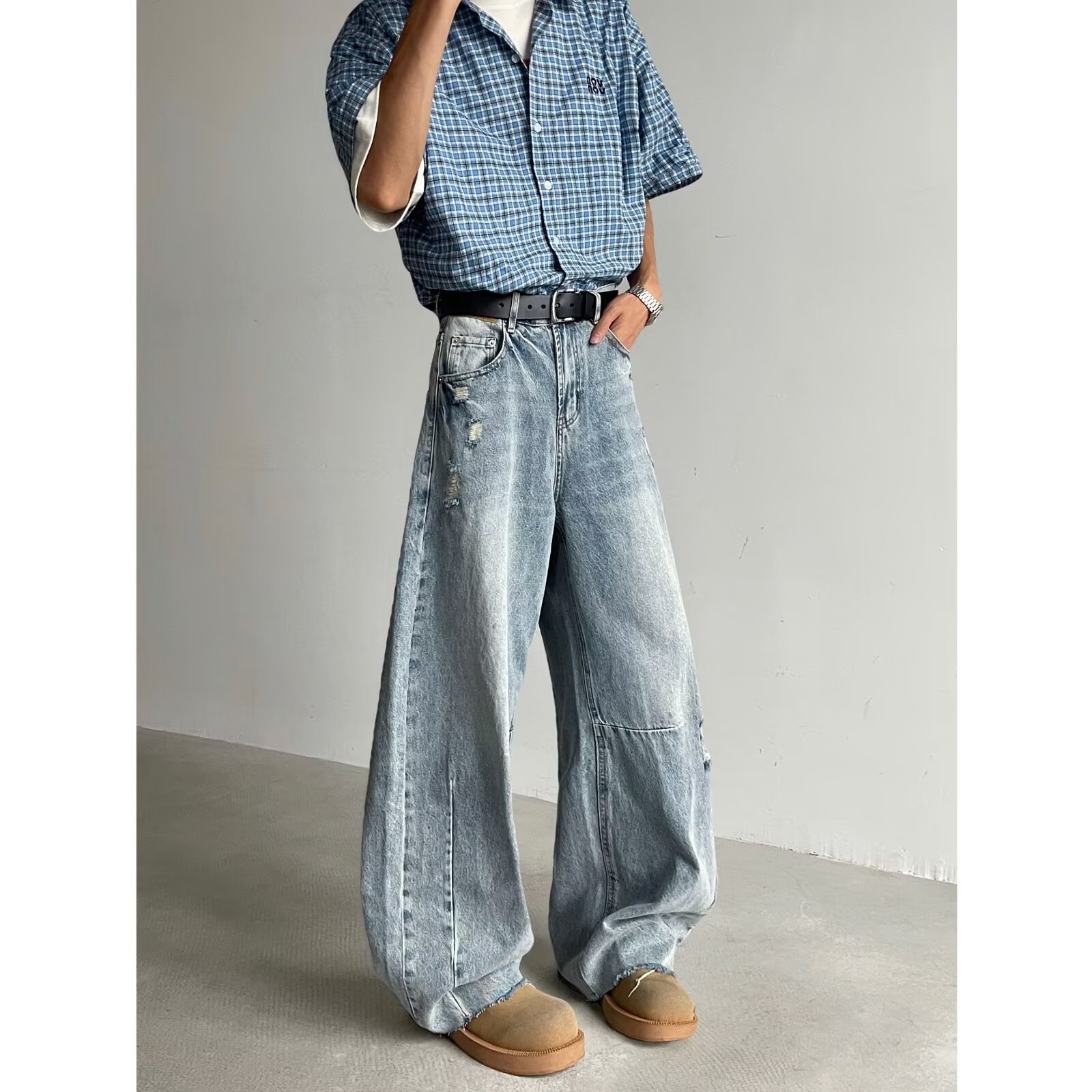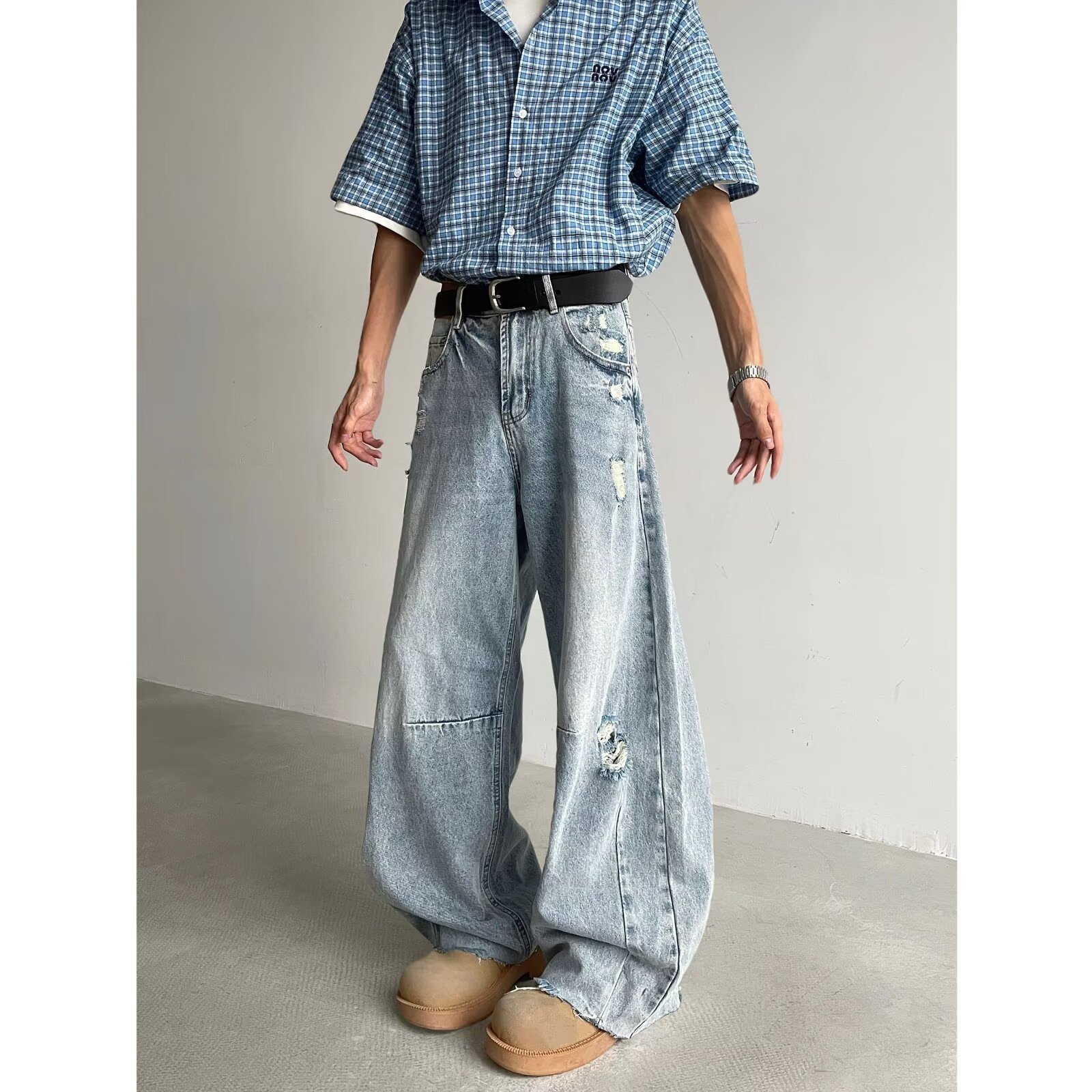Ripped Denim Loose and Slimming Versatile Wide Leg Pants with Frayed Edges