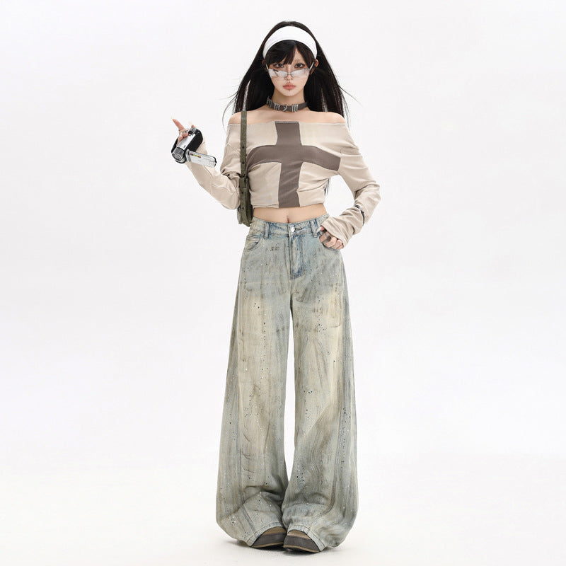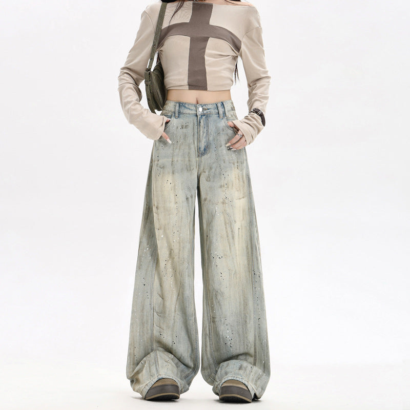 Spicy Girl Splatter Paint Graffiti Denim Pants for Women - Loose Slim High Waist Distressed Wide Leg Trousers