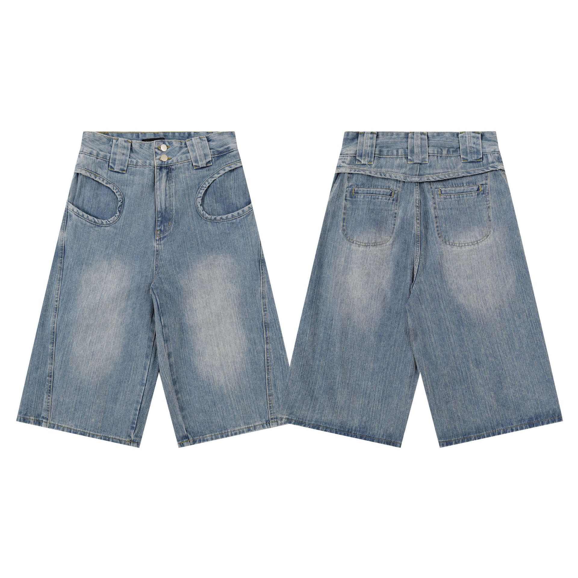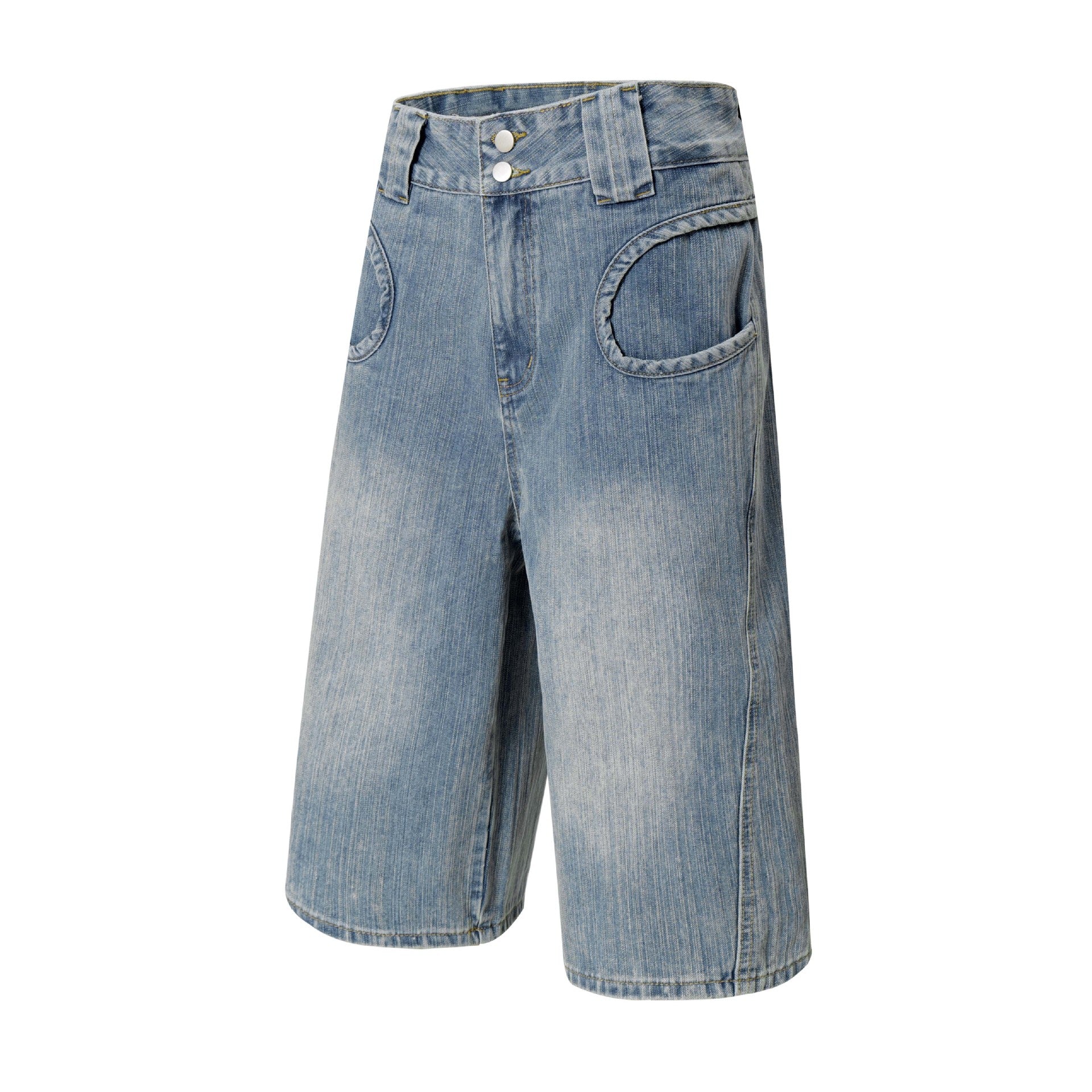 Street Style Washed Vintage Denim Shorts with Unique Pocket Design