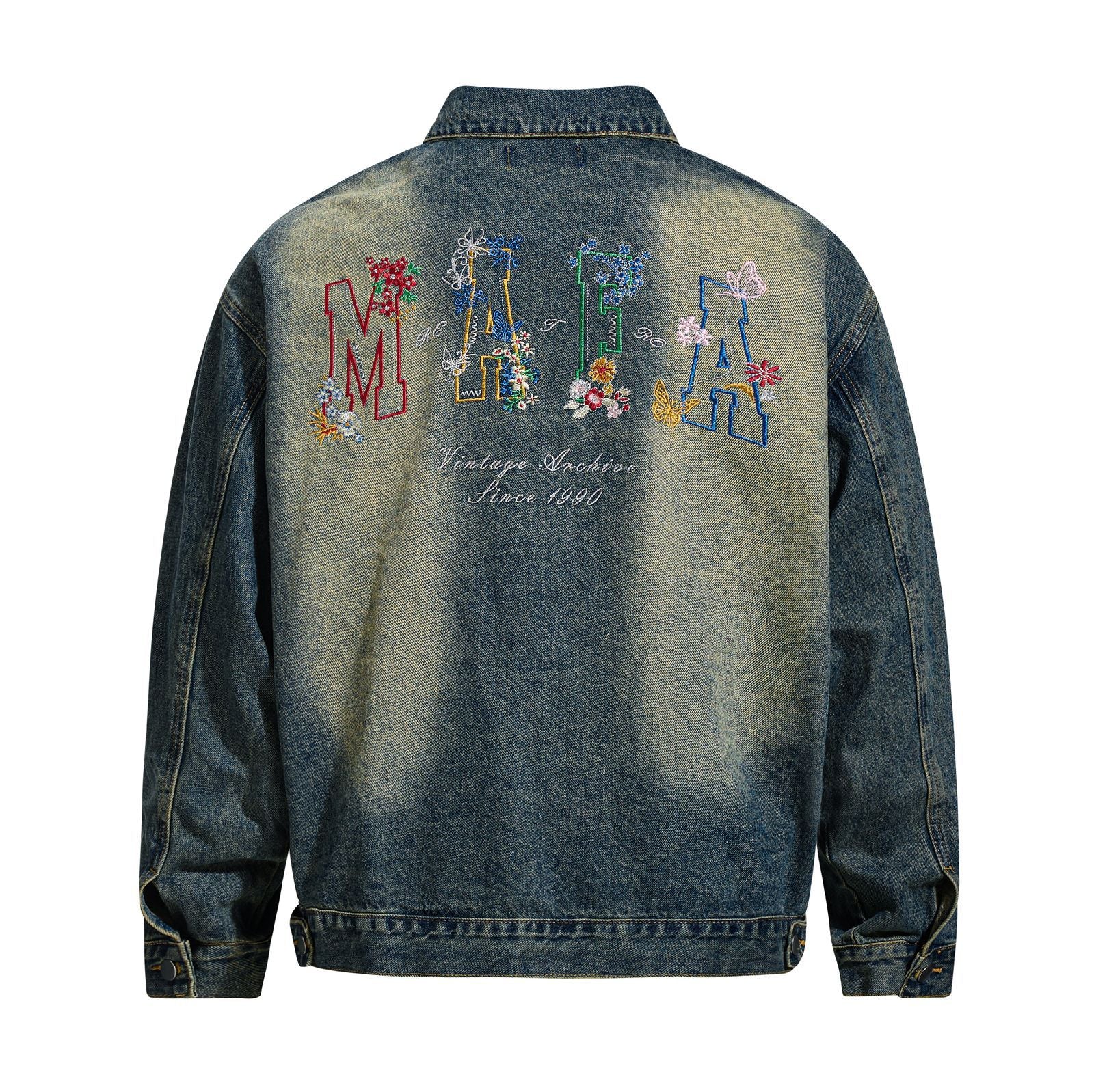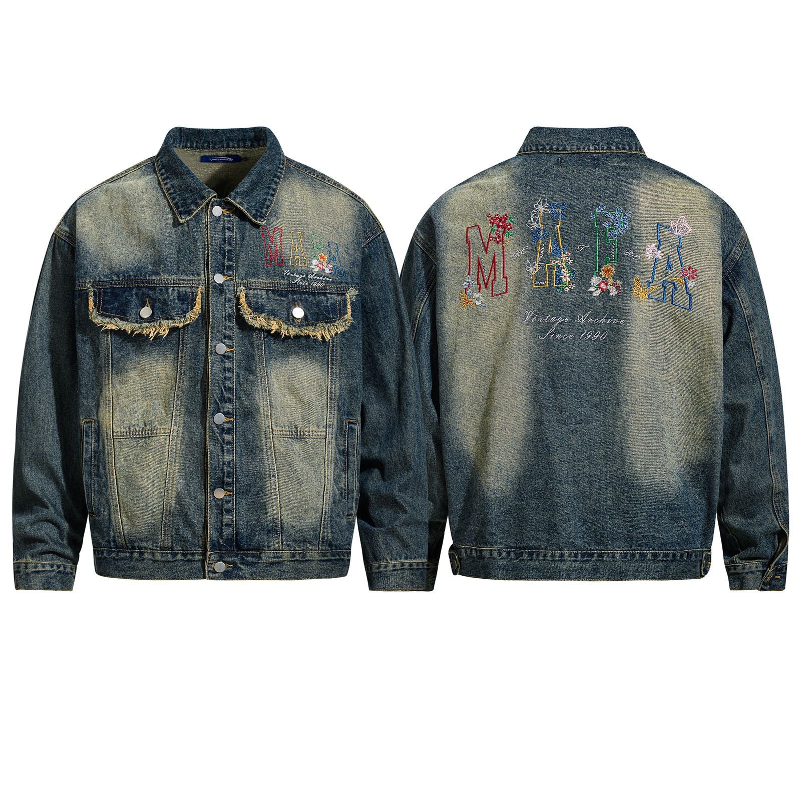 Streetwear Style Washed Denim Jacket with Colorful Letter Embroidery