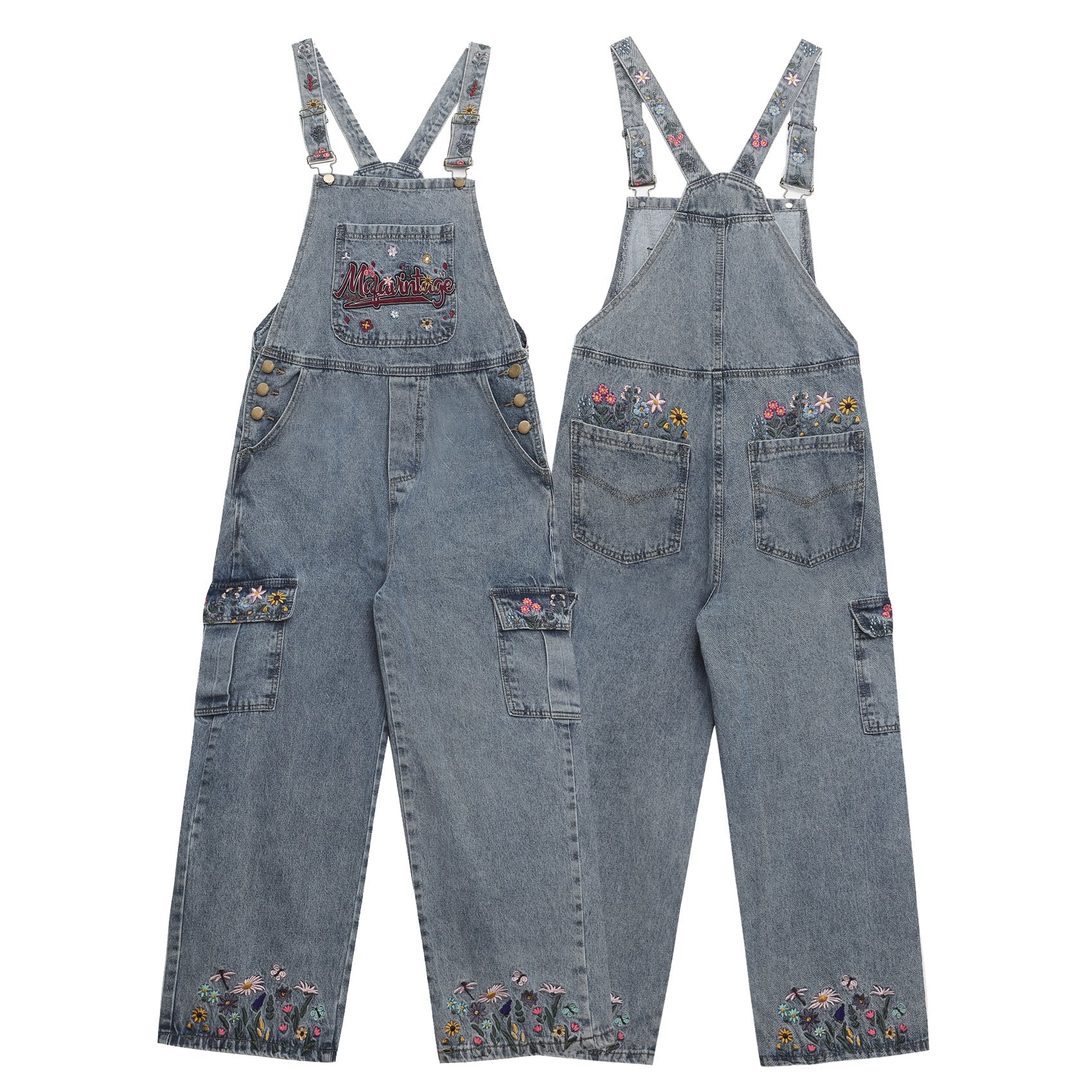 Trendy Washed Floral Letter Embroidery Denim Overalls Unisex High Street Retro Loose Jumpsuit