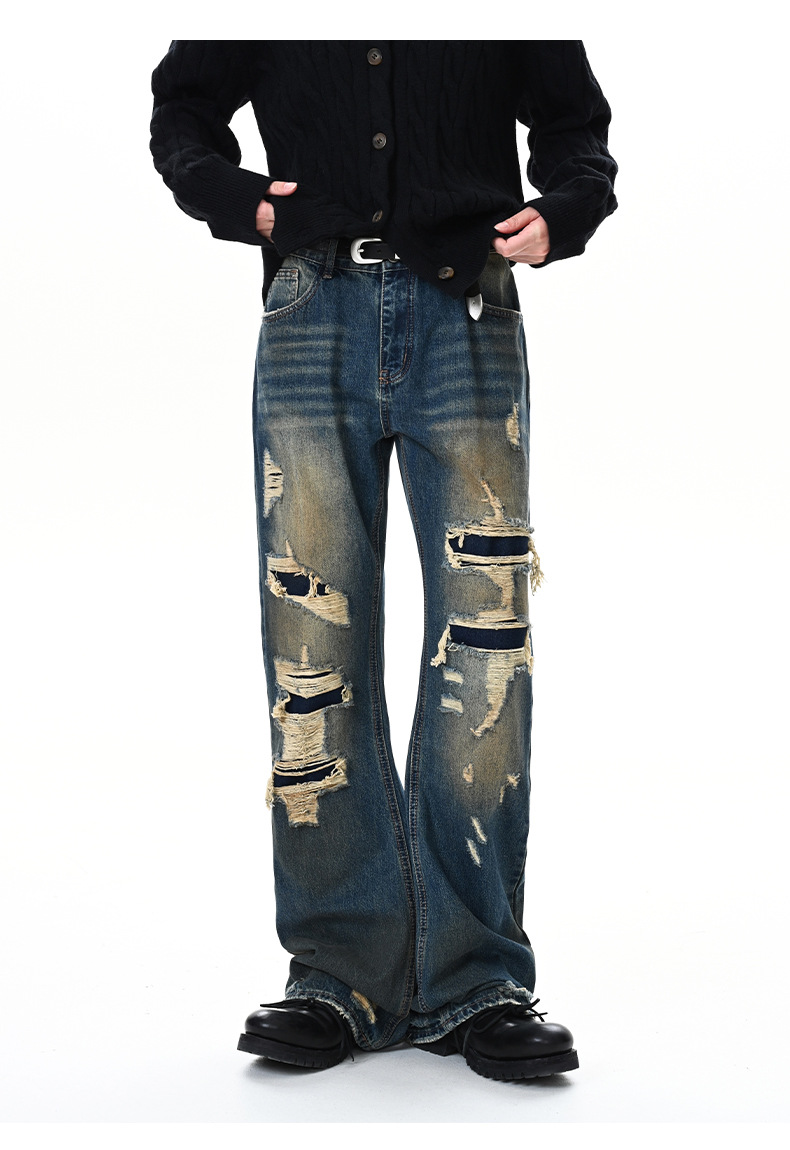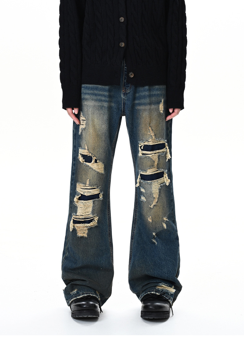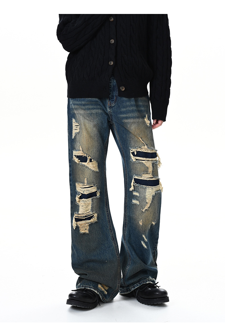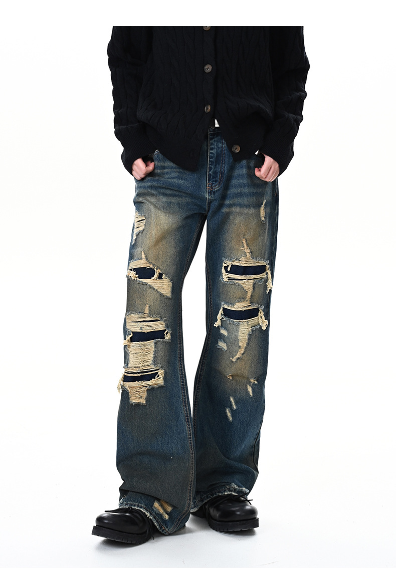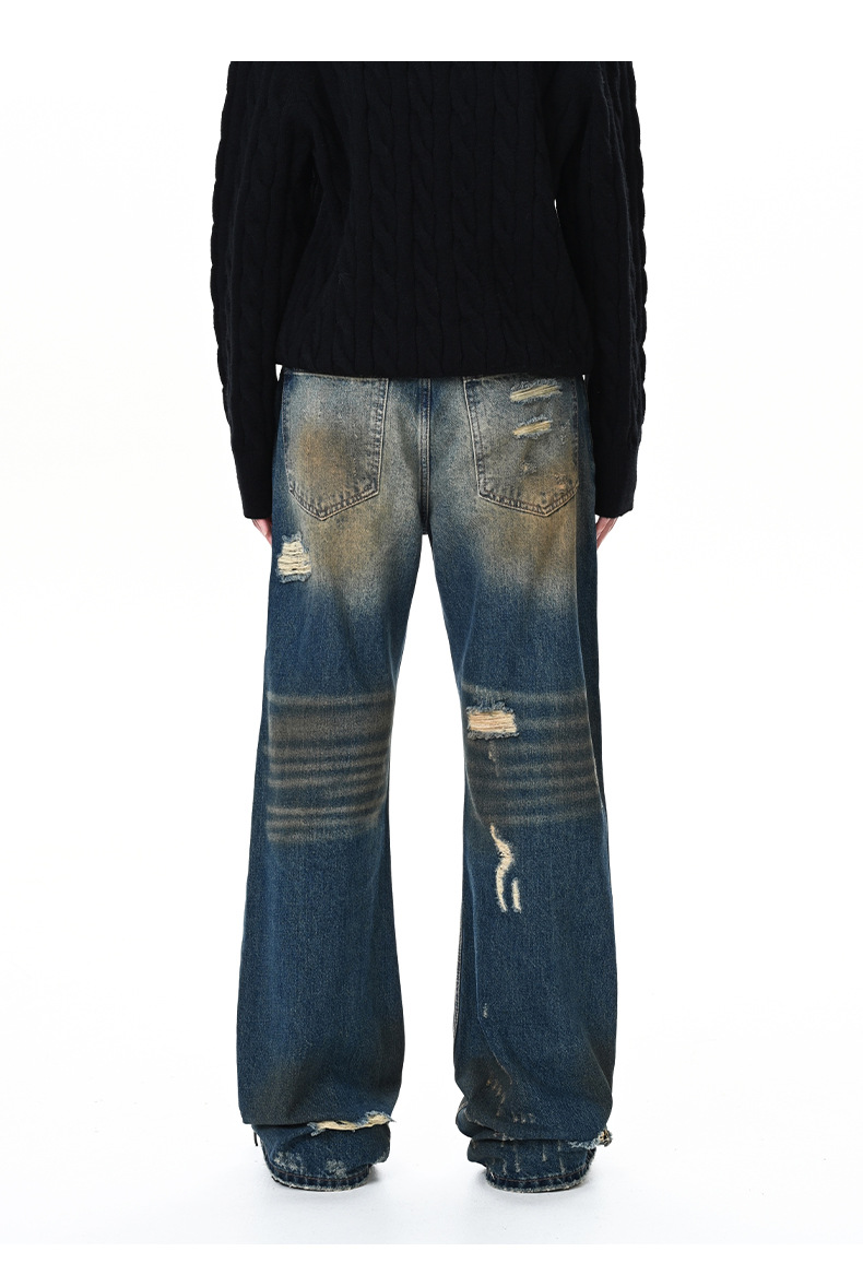 Washed Distressed Cat Whiskers Spray Monkey Dark Blue Denim Pants Unisex