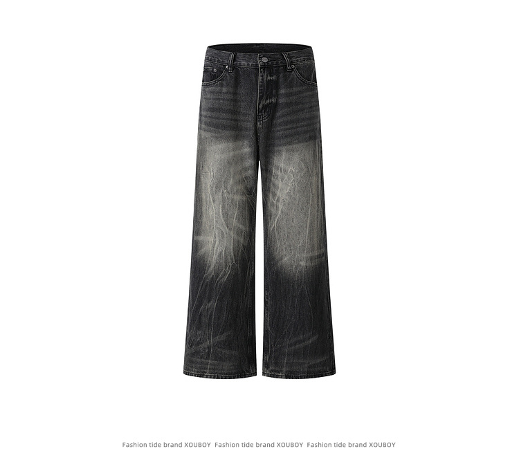 Washed Distressed Lightning Pattern Loose Vertical Flare Denim Pants Unisex