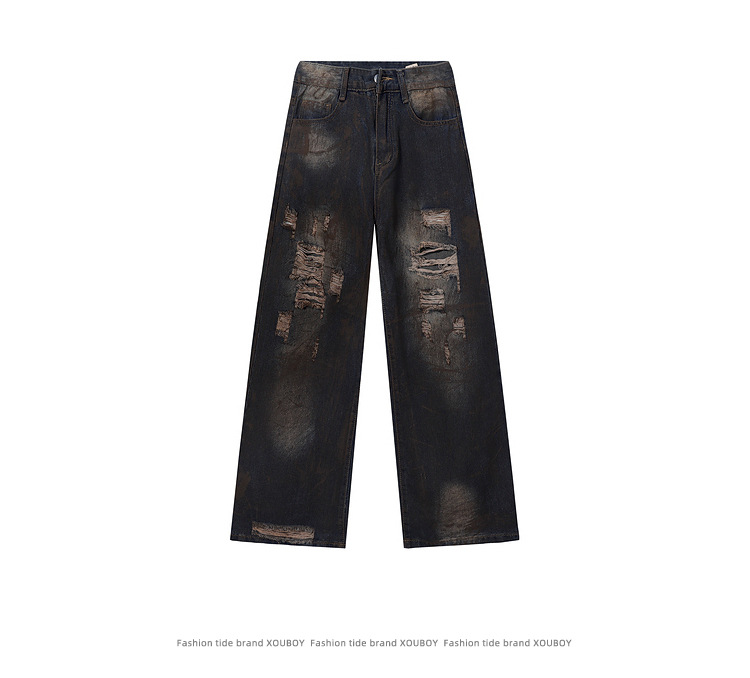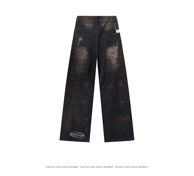 Washed Mud-Dyed Ripped Jeans - Men's Loose Wide-Leg Pants