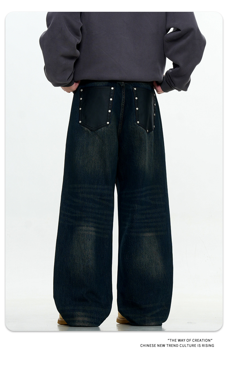 Water-Washed Distressed Loose Wide-Leg Rivet Punk Casual Long Pants