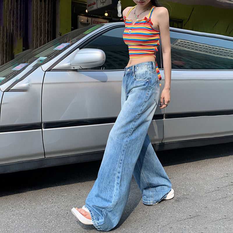 Women's Cracked Wash Blue Loose Vintage Straight Floor-Length Pants