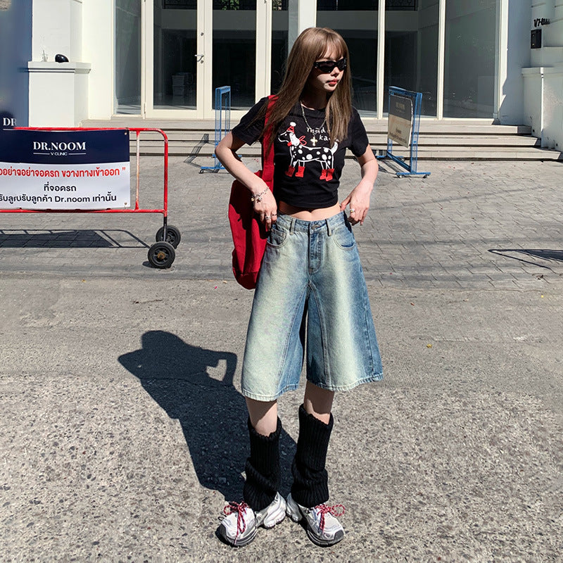Women's Washed Straight Denim Shorts - Loose Slimming Gradient Color Five-Point Pants